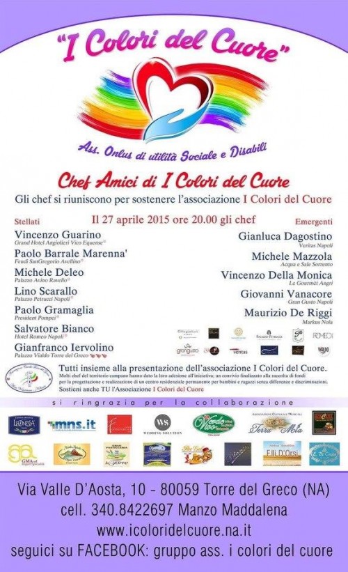 E’ in programma il 27 aprile alle ore 20 a Torre del Greco la serata di beneficenza a favore dell’associazione “I Colori del Cuore”. Un evento che vedrà in campo dodici protagonisti del gusto, personalità rinomate del settore gastronomico, chef stellati, pizzaioli e cuochi rinomati, supportati da numerosi produttori del territorio.