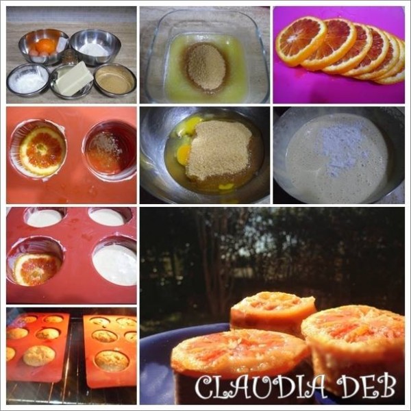 Sciogli 50 g di burro nel microonde o a bagnomaria. Aggiungi 50 g di zucchero, mescola e disponi un cucchiaio del composto ottenuto, sul fondo di ogni stampino monoporzione (io ho utilizzato lo stampo in silicone per muffin). Taglia l’arancia in fettine sottili e adagia una fetta in ogni stampino. Lavora con la frusta elettrica le uova con lo zucchero fino ad ottenere un composto spumoso. Unisci gli ingredienti secchi setacciati (un po’ alla volta) e il burro. Amalgama bene e versa un cucchiaio abbondante di composto negli stampini (sulle fette d’arancia). Cuoci in forno preriscaldato a 180° per 10 minuti. Fai raffreddare e sforma.