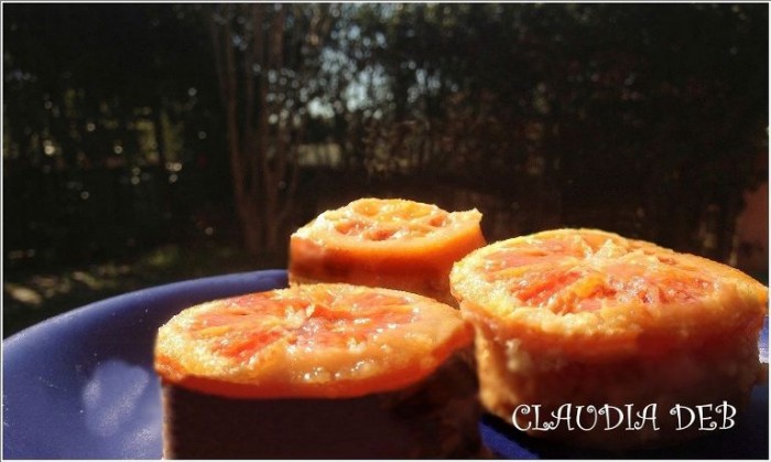 Sciogli 50 g di burro nel microonde o a bagnomaria. Aggiungi 50 g di zucchero, mescola e disponi un cucchiaio del composto ottenuto, sul fondo di ogni stampino monoporzione (io ho utilizzato lo stampo in silicone per muffin). Taglia l’arancia in fettine sottili e adagia una fetta in ogni stampino. Lavora con la frusta elettrica le uova con lo zucchero fino ad ottenere un composto spumoso. Unisci gli ingredienti secchi setacciati (un po’ alla volta) e il burro. Amalgama bene e versa un cucchiaio abbondante di composto negli stampini (sulle fette d’arancia). Cuoci in forno preriscaldato a 180° per 10 minuti. Fai raffreddare e sforma.