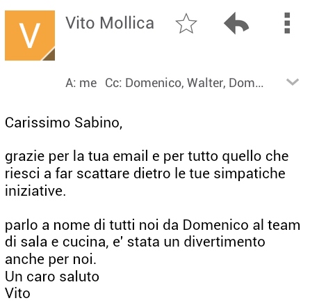 Noi (8 fortunati: ho dovuto limitarmi per precise disposizioni dello Chef) ci siamo divertiti, parecchio: la mia sensazione è che sia Vito Mollica sia Domenico Di Clemente e Walter Meccia si siano, altrettanto, divertiti.