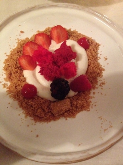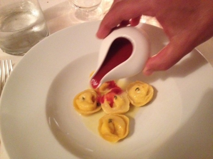Oltre all’effetto scenico, rappresentano un grandissimo piatto anche i Tortelli al dentice con salsa di pomodoro crudo versata sul momento; ottimo il bilanciamento acido/sapido e buona la tessitura del tortello.