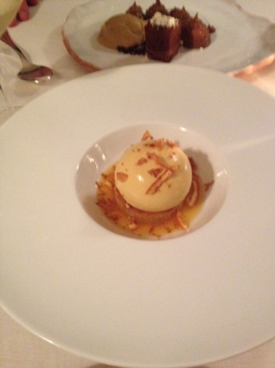 Acqua Pazza, Sfera al cardamomo, cuore al frutto della passione, pan di spagna alla cannella e zuppa di agrumi