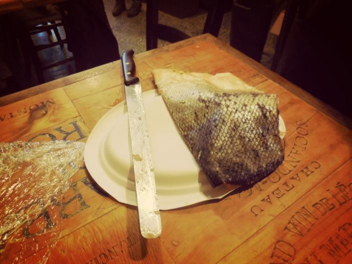 Ci alziamo. 30 € i vini. 22 € a testa il cibo. Salmone e Vino Il Pagliaio offerto.