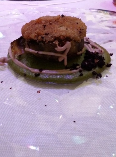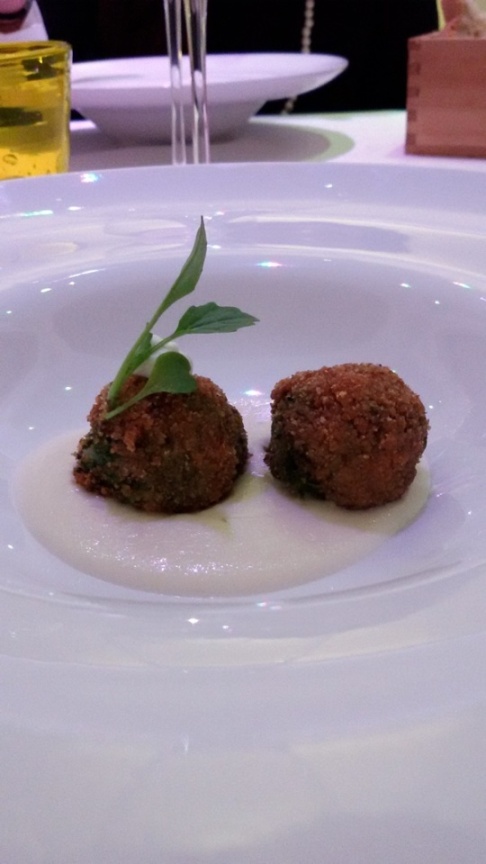 Arriva veloce e pronta a rappresentare il primo boccone, la “Polpetta di mallone e filetto di tonno su crema di topinambur”. Divertente, sfiziosa, la crema è delicata e crea un bel bilanciamento.