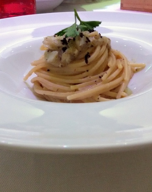 Immediato e godereccio lo “Spaghetto con baccalà, olive, capperi, pomodorino giallo e cipolla”. Un comfort food, quel piatto-salvezza in momenti di fame e/o sconforto. Carnoso, pieno.