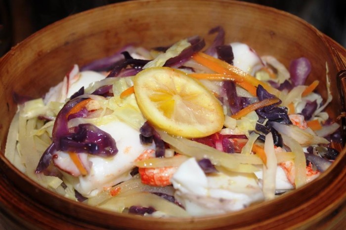 Vinile, cestino alla catalana: calamaretti, gamberi, spaghetti di verdure con salsa calda al dragoncello