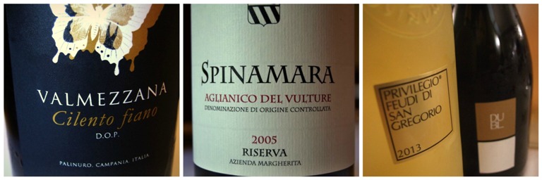 Locanda Severino, i vini: Fiano Cilento Valmezzana 2013 Albamarina, Aglianico del Vulture Spinamara Riserva 2005 Azienda Margherita, Privilegio 2013 Feudi di San Gregorio