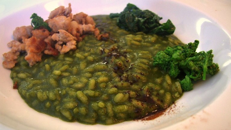 Locanda Severino, La Nebbia agli irti colli: risotto con cime di rapa, braciole di salsiccia e liquirizia al fumo di faggio (il piatto è servito sotto una campana di vetro che trattiene del fumo di faggio al suo interno)