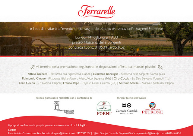 A concorrere al Premio, studenti ed ex studenti dell’Università Suor Orsola Benincasa, invitati a realizzare un articolo sul tema, sottoposto al giudizio di 5 membri di spicco del mondo dell’enogastronomia, del giornalismo e della cultura: Helga Sanità, antropologa e ricercatrice MedEat Research, Tommaso Esposito, scrittore e giornalista, Antonio Pace, Presidente Associazione Verace Pizza Napoletana, Enzo Coccia, maestro pizzaiolo, Michele Pontecorvo, Responsabile Comunicazione e CSR Ferrarelle SpA.