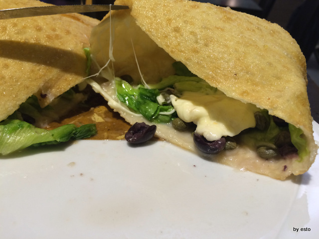 Il ripieno è inusuale: scarola riccia a crudo, olive, capperi e provola affumicata.