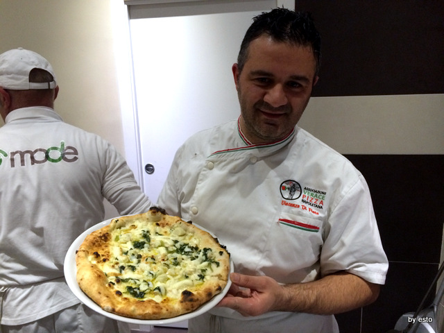 Gino Sorbillo ha fatto gustare la sua versione di Pizza Montorese con il pomodoro delle colline montoresi, anelli crudi di cipolla ramata di Montoro, pecorino di Carmasciano.