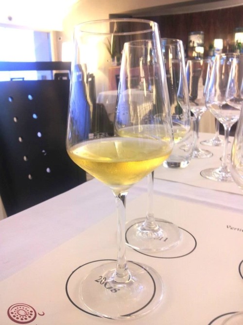Questa è stata un’annata particolare, porta con sé un lievissimo difetto olfattivo. Bellissimo comunque il colore, giallo paglierino dorato intenso, molto vivace e brillante. Buona la componente alcolica, è un bianco di corpo e di struttura. Il naso va su una spiccata mineralità, si distinguono anche note di fruttata esotica (ananas, papaya e mango), e floreali (fiori gialli ricchi e generosi come la ginestra), sentori di macchia mediterranea (origano e rosmarino) e minerali. In bocca è secco, asciutto, abbastanza caldo e secco, sapido. Ottima l’intensità gustativa.