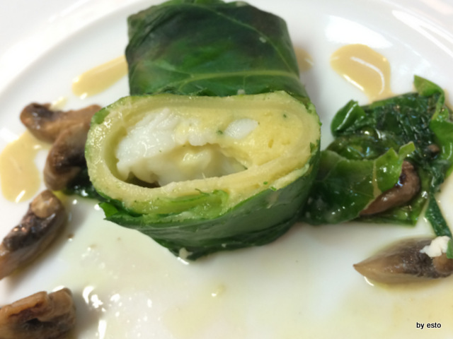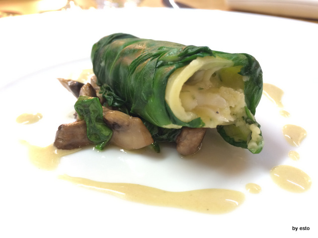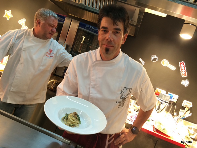 Heribert Dietrich ha preparato il pacchero ripieno di scampo crudo a mo’ di spätzle con bieta funghi e spinaci in una succulenta bisque e poi uno spaghetto con caldarroste tartufo e uovo fritto.