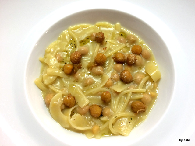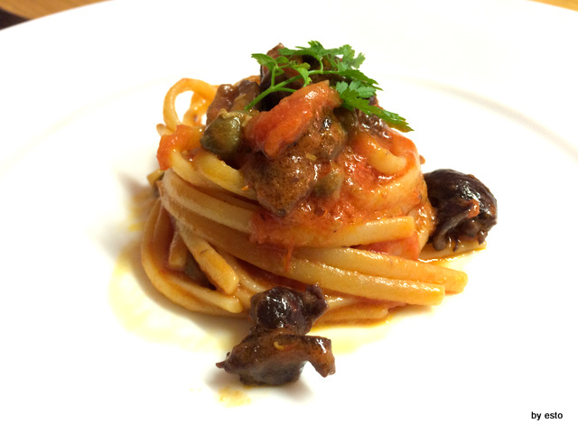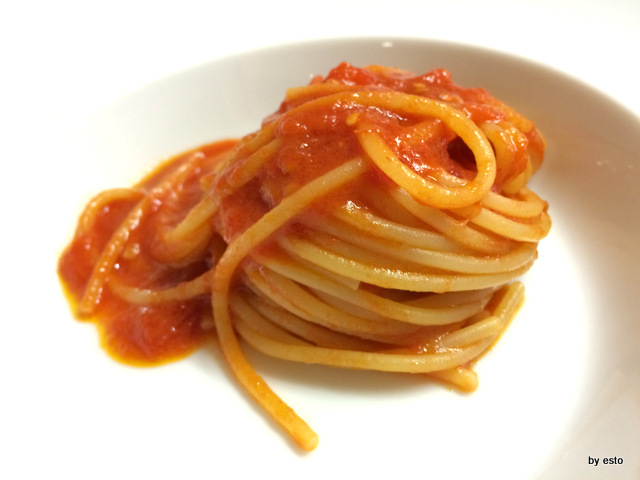 Peppe Guida, lancia in resta, di fila il Mischiato dei campi con ceci e aglio bruciato, la puttanesca con le linguine dei campi, le penne con la finta genovese e il pecorino romano, lo spaghetto al pomodoro.
