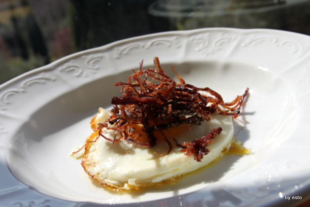 Goloso l’antipasto: Arriva l’uovo nero, uovo ruspante con cipolla arrostita e tartufo nero.