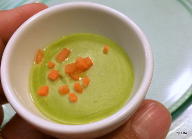 Gaspacho di crescenza, con contrasto indiano alla radice di curcuma, pesto di piselli e sedano verde, mandorle tostate e i germogli di crescione.