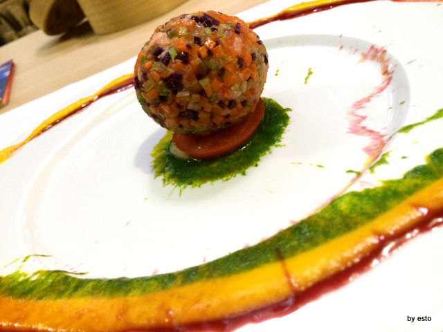 E’ la Panzanella con verdure croccanti e cuore di cannellini profumati al wasabi, letto rinfrescante di zafferano e lampone