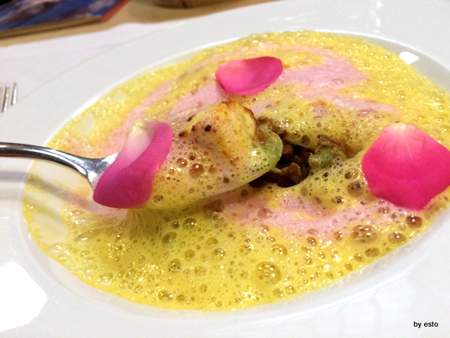 Passeggiata in quel bosco, con pesto di erbe, cuore di giovani carote e scorza di limone, cubi di ricotta affumicata, salvia croccante, fave, morchelle e altre sorprese nascoste sotto un morbido e gustoso manto impalpabile.