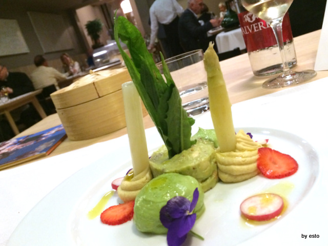 Insalata di erbe selvatiche da Giumaglio con gli asparagi bianchi di Federica Baj, il nostro classico pesto di avocado, paté di ceci e nocciole, spuma soffice di aglio orsino raccolto di là da quel ponte