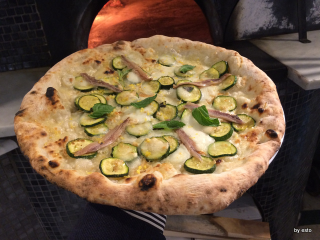 Michele Leo – Pizzeria Palazzo Petrucci Napoli- Scapece al limone: acciughe, provola affumicata, cipollotto fresco, zucchine, alici sott’olio, limoni, menta.