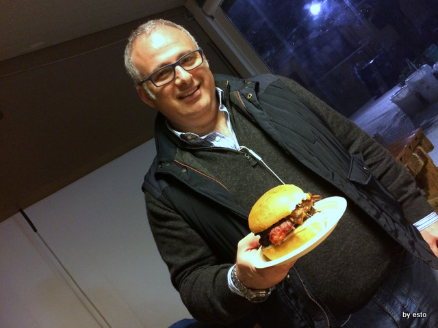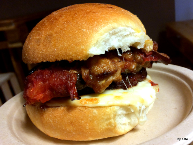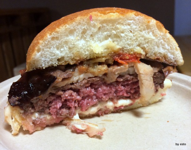 Contiene il grande hamburger di marchigiana, le melanzane, la provola affumicata e una losanga di ventresca di maiale cotta a bassa temperatura.