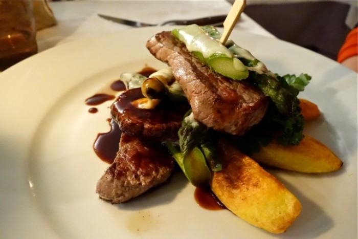 Millefoglie di medaglioni di manzo con asparagi e scamorza: la carne è ben selezionata, ma il piatto risulta essere troppo di pancia, addirittura per noi.