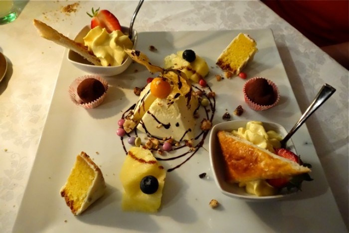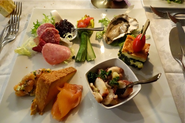 Questa scelta di proporre gli antipasti ( ma vedo anche i dolci) tutti in un piatto (usanza che ricorre anche dalle mie parti) la trovo brutta e al limite dell’autolesionismo. Sarà il risparmio sul lavaggio dei piatti, ma di fatto anche con materie prime buone il tutto sa di preconfezionato, perché anche la stimolazione salivare e cerebrale ne soffre con tutto quel fricandò di colori e sapori e perché poi, nonostante eventuali sforzi propositivi, tutto si confonde, tutto si inguacchia ( e non saprei come sta un’ostrica (?) con la torta pasqualina o il salmone col salame, o tutte le sciagurate combinazioni che volete). A volte ci vuole poco e abbondare non sempre è meglio di sottrarre.