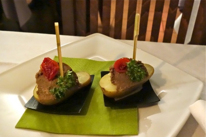 Amouse Bouche, patata novella con patè di fegatini, pomodorino confit e prezzemolo: unʼinizio coraggioso, quello col patè, che potrebbe appesantire il palato. Non questa volta, perchè è gustoso ma delicato, e la patata lo accompagna egregiamente.