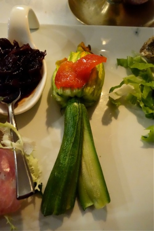 Antipasto Ricco di Terra e di Mare, ovvero, tar-tar di salmone, panbrioche, trota affumicata, polpo patate e fagioli, torta pasqualina, ostrica, fiore di zucca ripieno di ricotta e pomodorini confit, salame doja e salame dʼoca con cipolline caramellate: da ricordare la trota affumicata in casa ed il fiore di zucca, molto dolce.