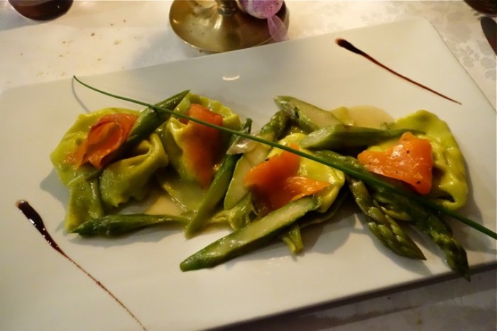 Tortellone agli asparagi con petali di trota affumicata in casa: un piatto che sa di casereccio, nella migliore delle sue accezioni. Facile vien da dire, con questa trota, che già