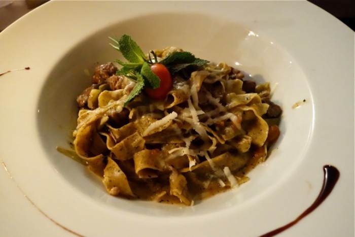 Tagliatelle di grano saraceno con ragù dʼagnello e carciofi, con menta e pecorino: Pamela ci spiega che lʼagnello proviene da un allevamento della Valsolda. Il piatto è gustoso, forse un po debole rispetto alle aspettative, per fortuna cʼè la menta che lo rinforza quanto basta.