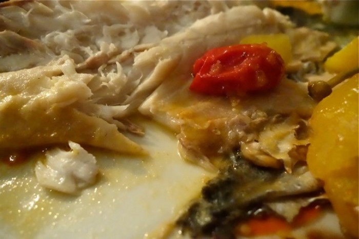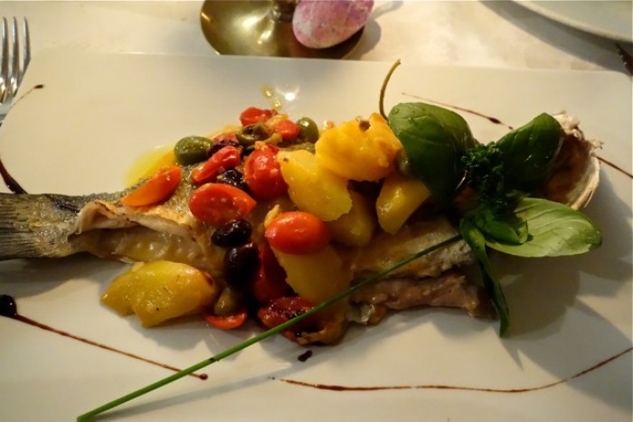 Branzino in guazzetto mediterraneo: un classico, ben eseguito, col sughetto penetrato nel pesce.