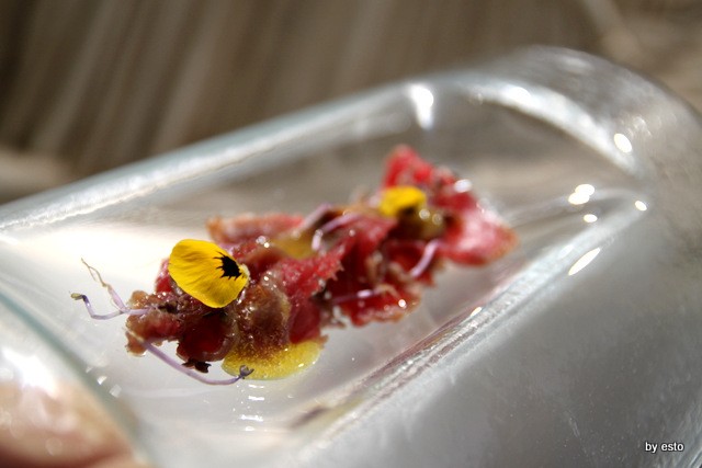 Carpaccio di marchigiana allevata nel Sannio, confettura di olio, insalata di germogli all’aceto di mirtillo e alici di menaica.