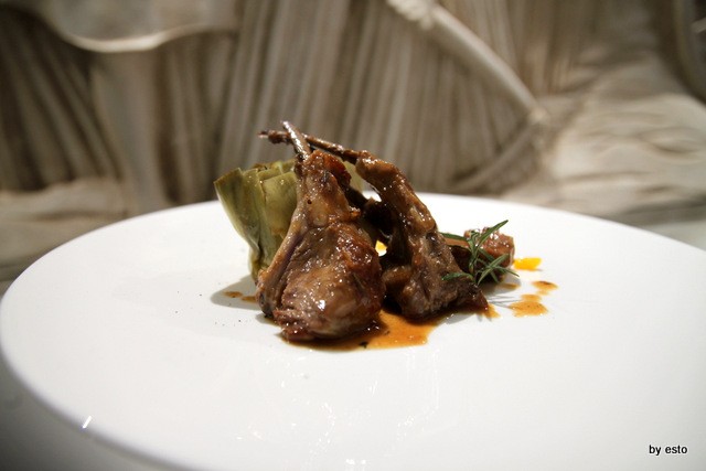 C’è la faraona dell’aia in carta, ma si opta per le Costine di agnello, carciofo finto arrosto.