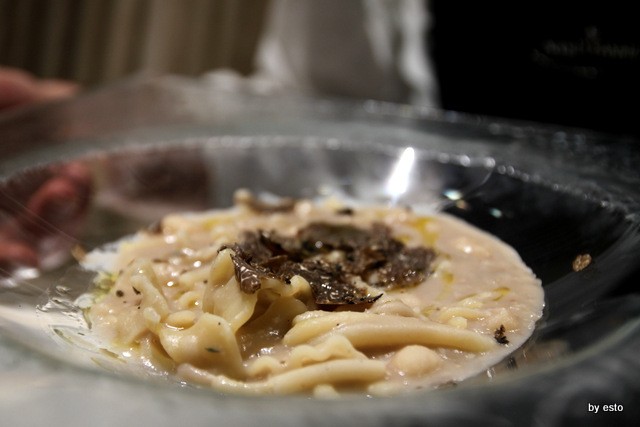 Un ingresso cremoso, all’apparenza rotondo, che però il fritto perfetto di questa farenella grossolana, un po’ di acidità del cacio e il sentore di tartufo rendono stimolante. Bello.