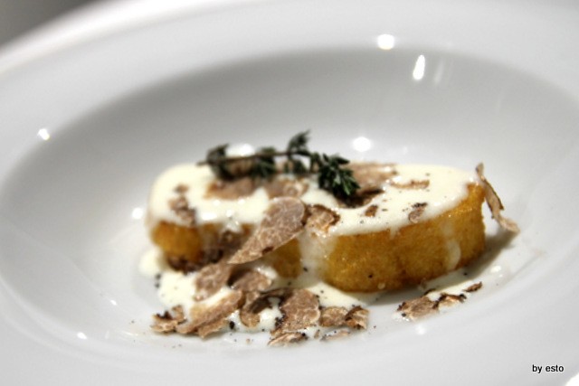 Scagliozzo di polenta con crema di caciocavallo di Agerola e tartufo bianco del Matese è il benvenuto.