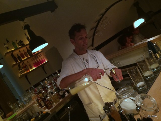 Al banco, con barman, camuffato da vero farmacista con tanto di contagocce e provette, i drinks.