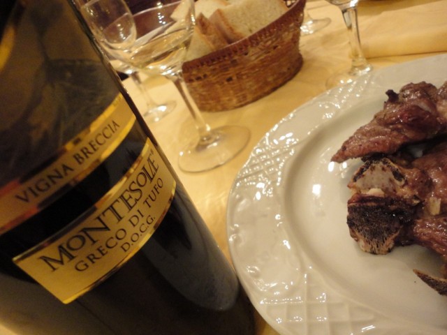 Il primo sorso si è militarmente piazzato ai lati della lingua come a presidiare zone di confine, per poi invadere anche il centro, occupando così, tutte le papille gustative. Al secondo, la pienezza di bocca si è confermata completa, dandoci una sensazione di avvolgente sapidità. Ecco, siamo prigionieri di Vigna Breccia…ma ci siamo “quasi ” liberati grazie a quella delizia che ci avevano preparato in abbinamento : Sua maestà il “Mallone”, dico quasi perchè l’abbinamento non è risultato perfetto, il vino prevaleva sul piatto(e ci credo!!!). Allora, ricordandomi dei suggerimenti di abbinamento del Greco di Tufo con l’agnello, che Angelo Muto (Cantine dell’Angelo) più volte mi aveva dispensato a larghe mani nel mio più completo scetticismo, l’ho voluto provare anche sull’agnello alla brace.