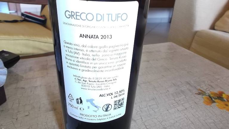 Una sola etichetta aziendale prodotta e naturalmente si tratta del Greco di Tufo Docg, di cui ho degustato l’annata 2013 che matura in acciaio ed in vetro. Gradazione alcolica di dodici e mezzo.