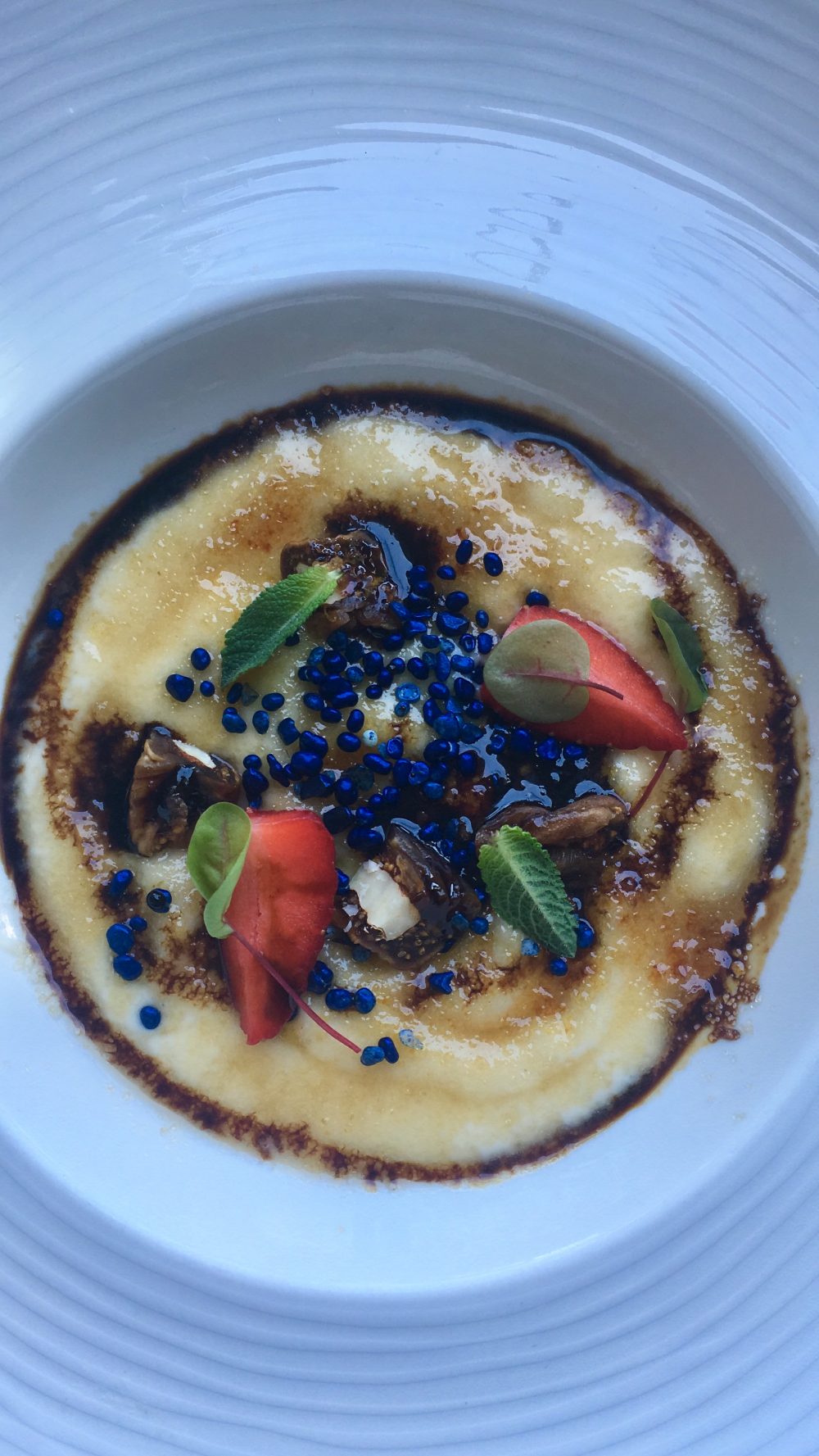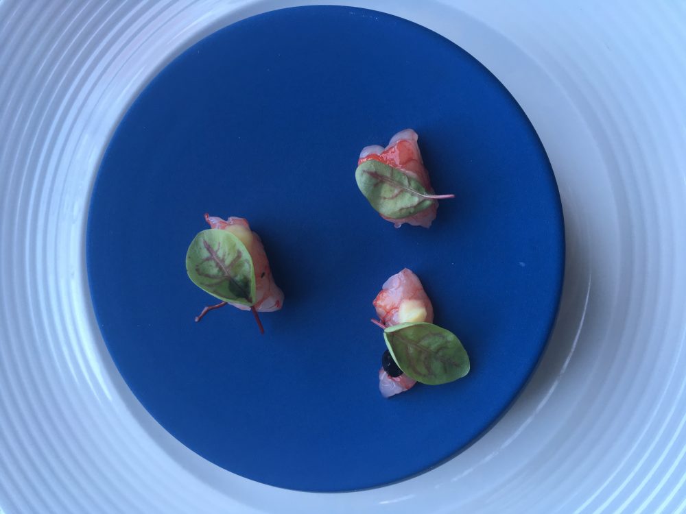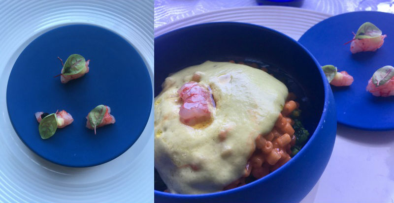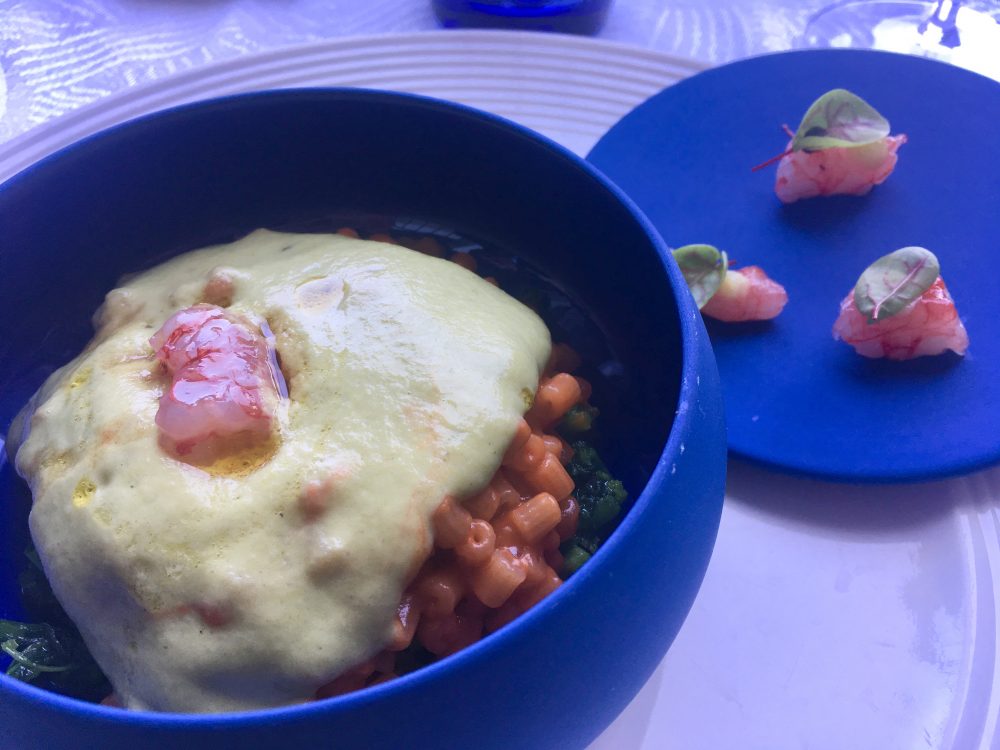 Tutti i piatti pensati per Grotta Palazzese nascono dall’ispirazione del mare, visibile dalla cucina. Vera musa visibile e tangibile, l’acqua di smeraldo ha contribuito alla costruzione di una memoria duratura, nuova, che gioca sul colore, sul sapore e sull’esperienza. Da questo nasce il Tubettino mantecato con bisque di gambero rosso, in abbinamento a cima di rapa in doppia cottura (spuma a copertura della pasta e cima saltata mista al tubettino). Servito in un’elegante cocotte blu, sulla sommità del coperchio, quasi macchie di colore su una tavolozza, ci sono i gamberi rossi con gel di limone e crema di aglio nero. Partendo dall’elemento caldo, la degustazione del boccone crudo fresco completa la sublime esperienza di mangiare uno dei simboli della Puglia – la cima di rapa – con gli occhi annegati nel verde del mare.