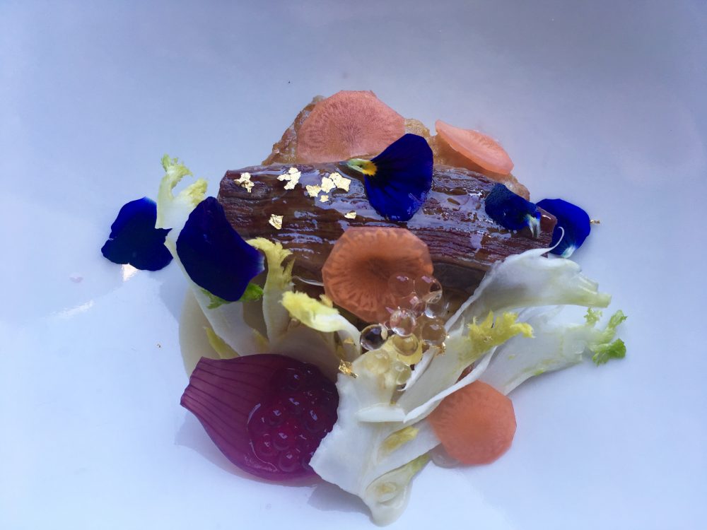 L’estetica dei nuovi menu pensati da Felice Sgarra racconta un sogno sontuoso, fatto di ori e velluti, morbidezze. Tra i secondi proposti spicca la Ventresca di tonno pinne blu e Wagyu, perle di aceto di fichi, topinampur e piccolo pinzimonio. Completano il piatto scaglie d’oro e una spruzzata del potente aceto affumicato tosatsu. La carica acida di questo piatto, smorzata appena dalla spuma di topinambur, ricorda una travolgente onda estiva in una giornata di vento, con l’acqua che ti finisce nelle radici e sulla lingua, i sensi schiaffeggiati dalla salsedine e il sorriso di chi ha ama i cavalloni estivi.