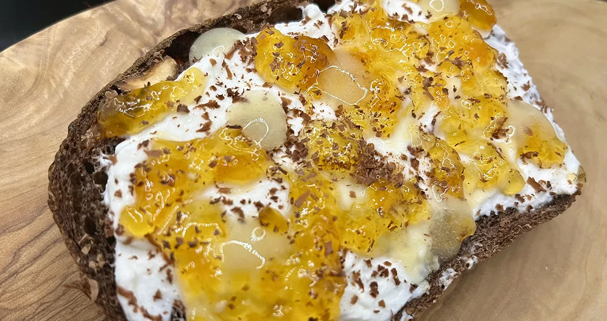 Tagliare una fetta di pane e servire con ricotta di bufala campana DOP, gelèe di limone salato, confettura di Albicocche del Vesuvio e una spolverata di cioccolato fondente all’80%.