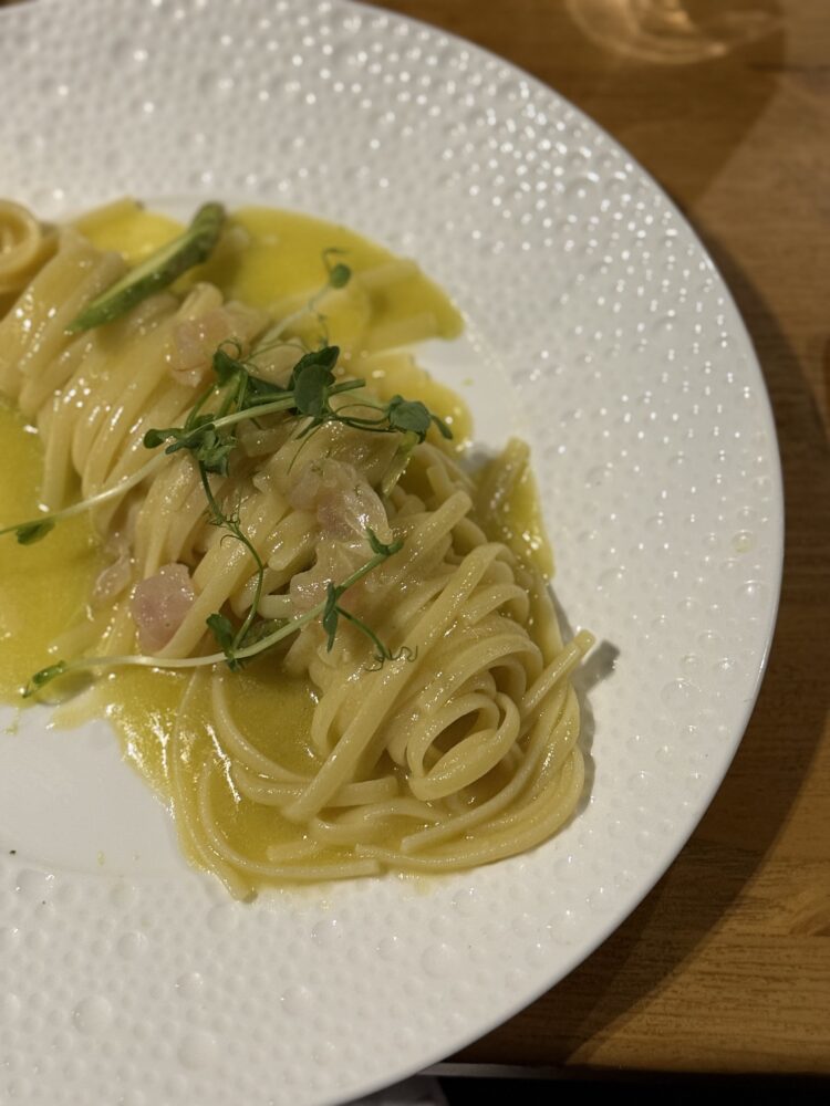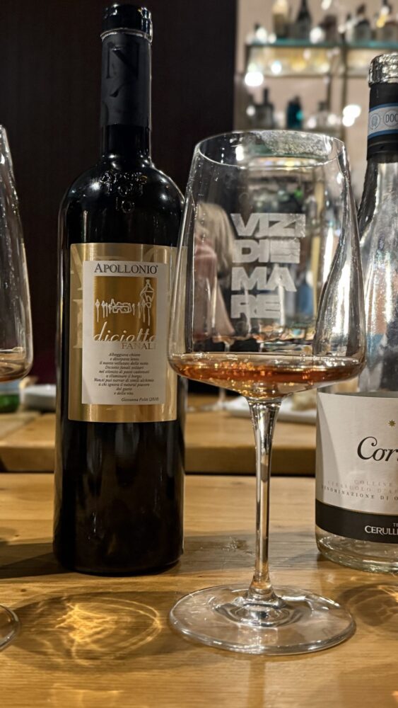 Con le linguine all’acqua di mare, gallinella e asparagi, il confronto si è fatto più articolato. Il Salento Rosato IGP “Diciotto Fanali” 2018 di Apollonio, da Negroamaro, ha evidenziato maturità aromatica e continuità strutturale, dimostrando come un rosato del Sud possa sostenere preparazioni complesse mantenendo equilibrio e persistenza.