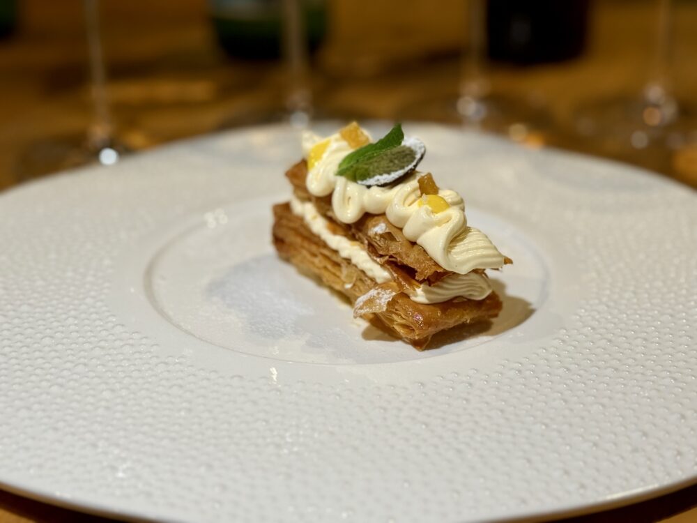 La chiusura con la millefoglie alla crema chantilly, limone candito e sale Maldon ha mantenuto coerenza con il percorso, lavorando sull’equilibrio tra dolcezza e tensione acido-sapida.