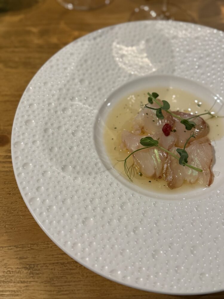 Ad aprire è stato il Chiaretto di Bardolino DOC “Tecla” 2024 di Benazzoli, da Corvina e Rondinella, in abbinamento al sashimi di rana pescatrice, maturata 12–15 giorni con alga kombu e servita con il suo grasso, peperoncino, prezzemolo e aglio. La verticalità del vino, sostenuta da acidità vibrante e nitidezza aromatica, ha contrastato la concentrazione umami del piatto mantenendo pulizia e continuità gustativa.