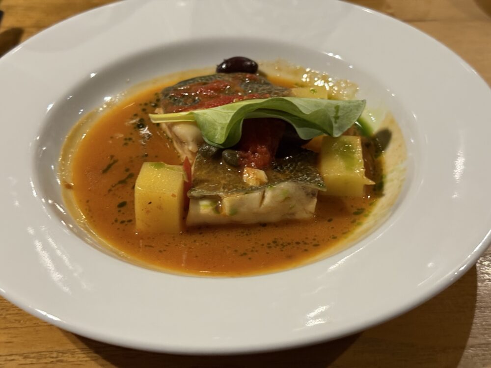 A seguire, il Cerasuolo d’Abruzzo DOC “Cortalto” 2024 di Tenuta Cerulli Spinozzi, da Montepulciano in purezza, ha accompagnato la tapas di spigola locale con patate, pomodorini, olive taggiasche e capperi di Salina. La maggiore tessitura del vitigno ha conferito al vino ampiezza e solidità, sostenendo la struttura del piatto senza rinunciare a tensione e definizione.