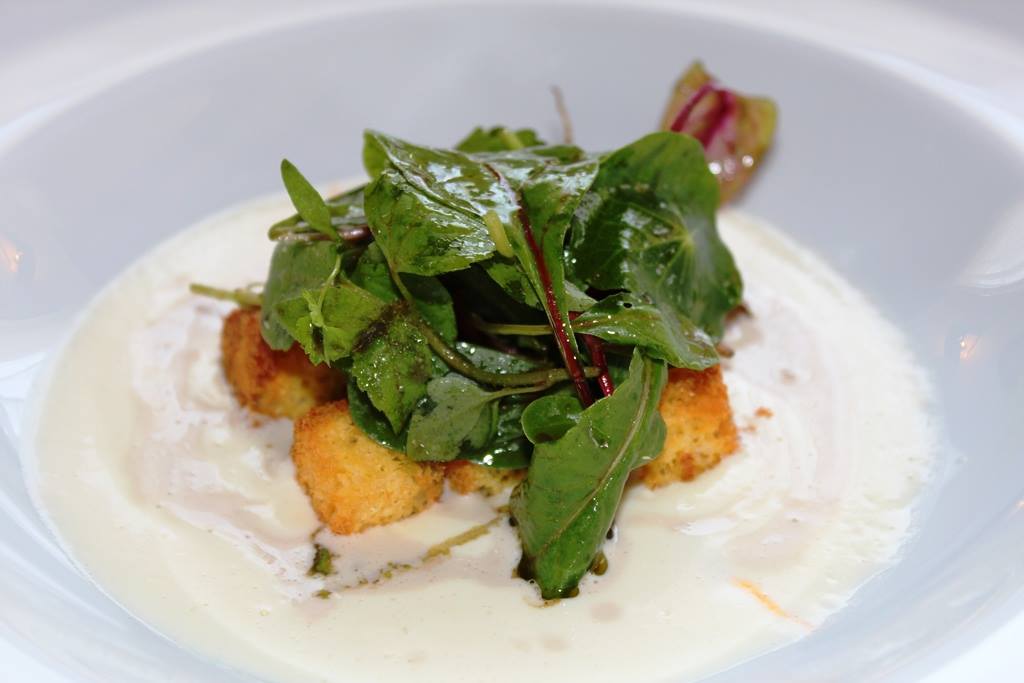 Giochino simpatico, due ingredienti di forte personalità come le erbette e le acciughe smorzati da due ingredienti con un gusto basico come la ricotta e i crostini di pane, un filo di olio evo dona eleganza aromatica.