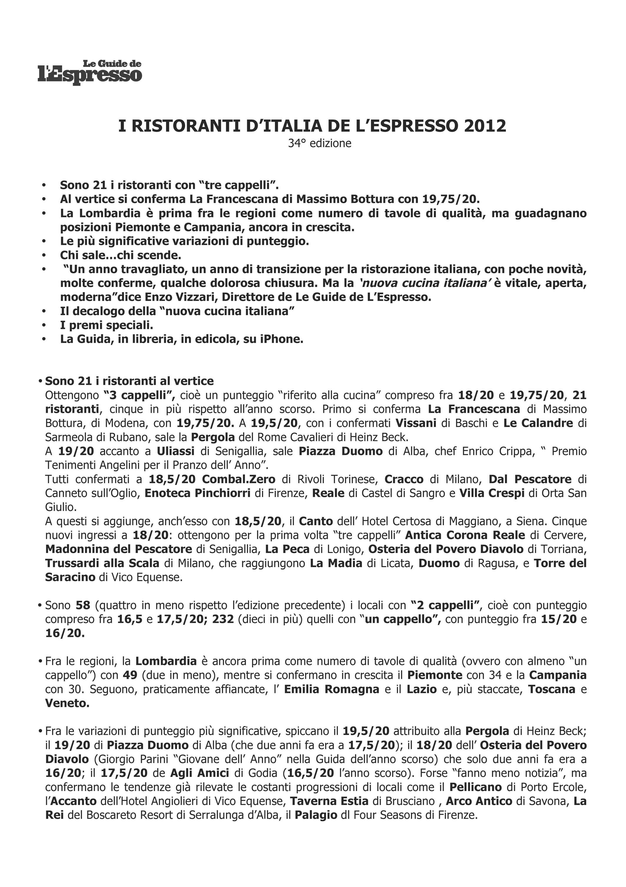 c.I Ristoranti de L’Espresso 2012_Pagina_1 5/10/2011 Torna a: Guida Ristoranti Espresso 2012. I migliori in Italia, chi sale e chi scende ← PrecedenteSuccessiva →