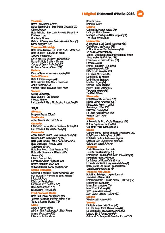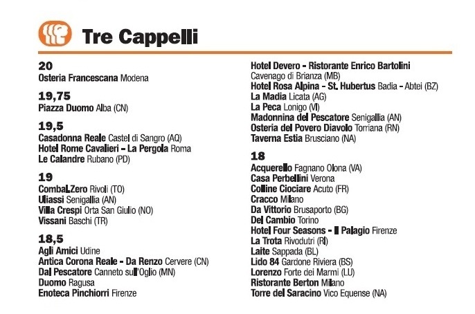 5.Promossi a 18,5/20 Agli Amici (Emanuele Scarello) di Udine e Taverna Estia (Francesco Sposito) di Brusciano. Confermati a 18,5/20: Antica Corona Reale (Giampiero Vivalda) di Cervere, Dal Pescatore (Santini) di Canneto sull’ Oglio, Duomo (Ciccio Sultano) di Ragusa- Ibla, Enoteca Pinchiorri di Firenze, Enrico Bartolini di Cavenago Brianza, St. Hubertus (Norbert Niederkofler) di Badia, La Madia (Pino Cuttaia) di Licata, La Peca (Portinari) di Lonigo, Madonnina del Pescatore (Moreno Cedroni) di Senigallia, Osteria del Povero Diavolo (Pier Giorgio Parini) di Torriana.