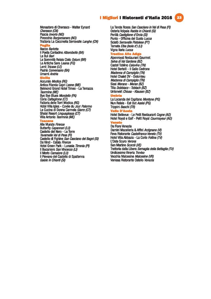 6.Sono promossi a 18/20 Acquerello (Fagnano Olona), Del Cambio (Torino), Il Palagio dell’ Hotel Four Seasons (Firenze), La Trota (Rivodutri), Lido 84 (Gardone Riviera), Lorenzo (Forte dei Marmi), Ristorante Berton (Milano). Esordisce a 18/20 Casa Perbellini (Verona). Sono confermati a 18/20 Colline Ciociare (Acuto), Cracco (Milano), Da Vittorio (Brusaporto), Laite (Sappada), Torre del Saracino (Vico Equense).